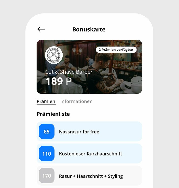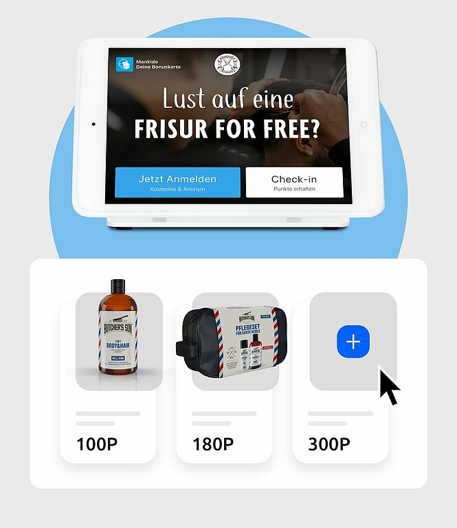 Mit dem iPad-Terminal vergibst du Bonuspunkte, die Kunden für attraktive Prämien einlösen können. Verschieden wertvolle Prämien führen dazu, dass deine Kunden die höchste Prämie erreichen wollen. Dadurch besuchen sie häufiger deinen Barber Shop.